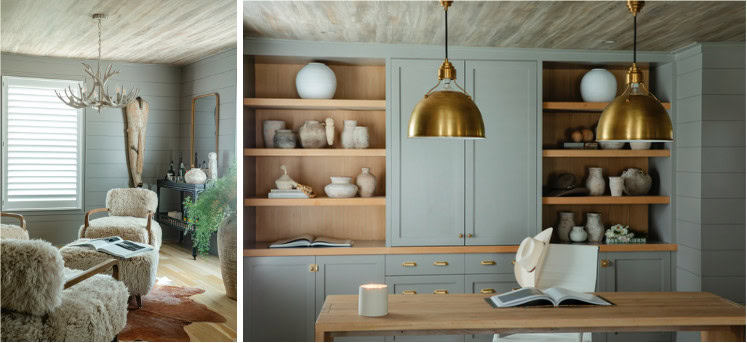 Don’t get me wrong, I’m a beach girl through and through but the Wyoming Grand Tetons, Yellowstone and Montana Paradise Valley region absolutely won my heart. I began by painting the shiplap my favorite muddy brown “Low Tide” from our A La Plage paint collection with Ring’s End. The perfect moody and earthy hue that makes a quiet statement. Although I wish I could have splurged on a real rustic wood ceiling, I instead called my dear and talented decorative painter, Stephen with Floe Painting, to create the same vibe. I mean, can you even?